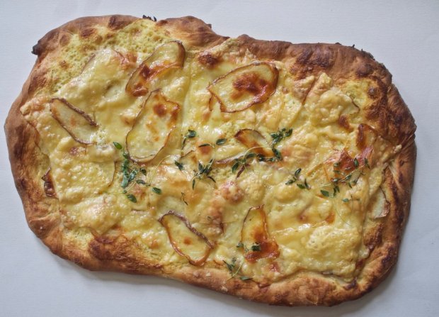 Potatoes on pizza is a classic Italian combination, and there’s nothing quite so comforting as carb on carb. The dough is tender and puffy, the potatoes are sliced so thin that they’re almost translucent and so they crisp up quickly under the oven’s heat. I draped slices of nutty, sweet Emmentaler over the pizza, but you could definitely use Gruyere if you can stomach the price. A schmeer of rich, creamy mascarpone with mustard, chilli, and cider vinegar spikes the bland calmness of the other ingredients and the resiny pungency of thyme is just, I don’t know, I really love thyme and like putting it on everything.