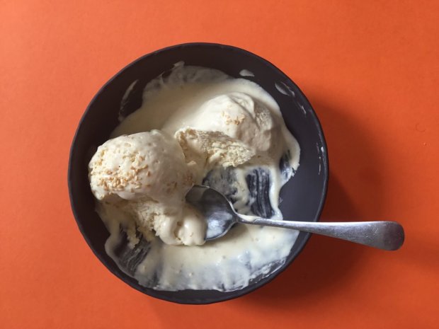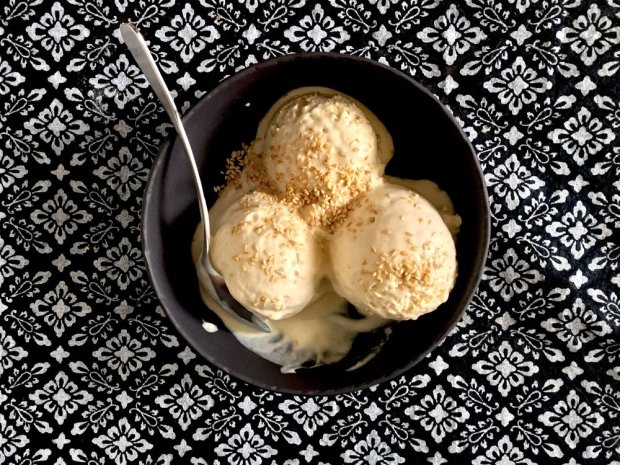This makes for a really lovely, slightly unusual flavoured ice cream – there’s an almost savoury quality to all that sesame, but its toasty nuttiness, and I’m sorry to re-use adjectives but there’s only so many bloody ways to say it – is just wonderful against the thick, soft, creamy backdrop of the ice cream. The honey adds gentle sweetness and all in all it’s a very mellow, mild ice cream, the sort that would be ideal under lots of toppings – some toasted pine nuts or walnuts, a further drizzle of sticky, slow-moving honey, some dark, dark melted chocolate, or as I did, a scattering of sesame seeds, for obvious reasons.