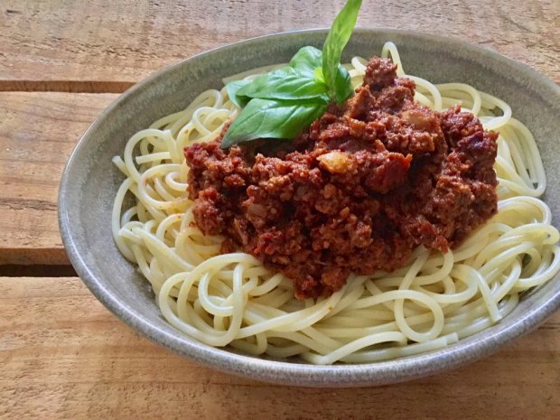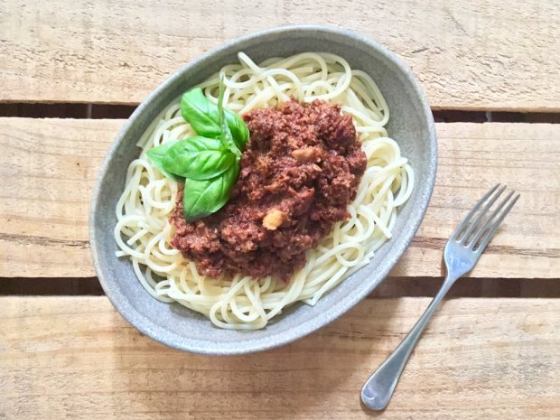 And another small but nevertheless achieve-y achievement: I made myself some food! WooooOO! It was actually a staff meal at work that inspired me to make this vegan take on spaghetti bolognese, we were given pasta with sundried tomatoes and pine nuts and there was something in the richness and bite of It all that made me want to extrapolate it out further. I figured that walnuts would provide texture and a little smokiness and mushrooms would add further depth and that if you blended them with said sundried tomatoes, so you couldn’t tell where one element started and another finished, it could be an extremely good time. All three of these ingredients have a kind of meatiness, not that they actually taste like meat, but they’ve got body and heft and savoury intensity and presence.
