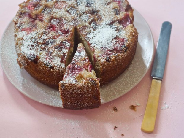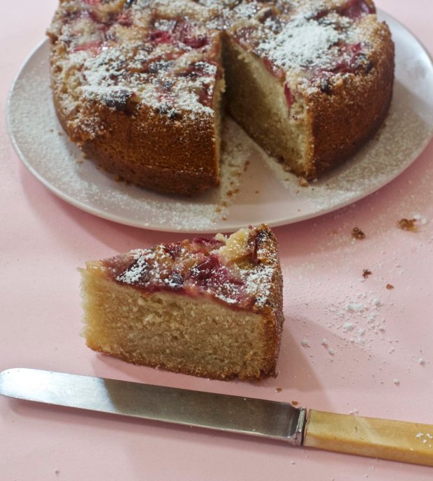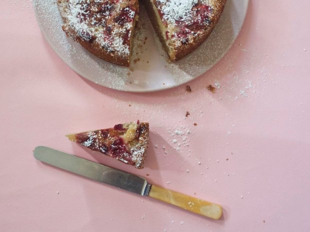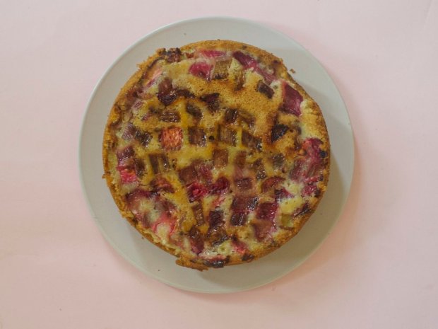 I scattered some pink peppercorns across the rhubarb before draping over the cake batter; I liked the pink-on-pink dovetailing and their musky-sweet warmth is lovely with rhubarb’s jammy tartness. If you don’t have them though just leave them out – regular pepper is too harsh to substitute in here.