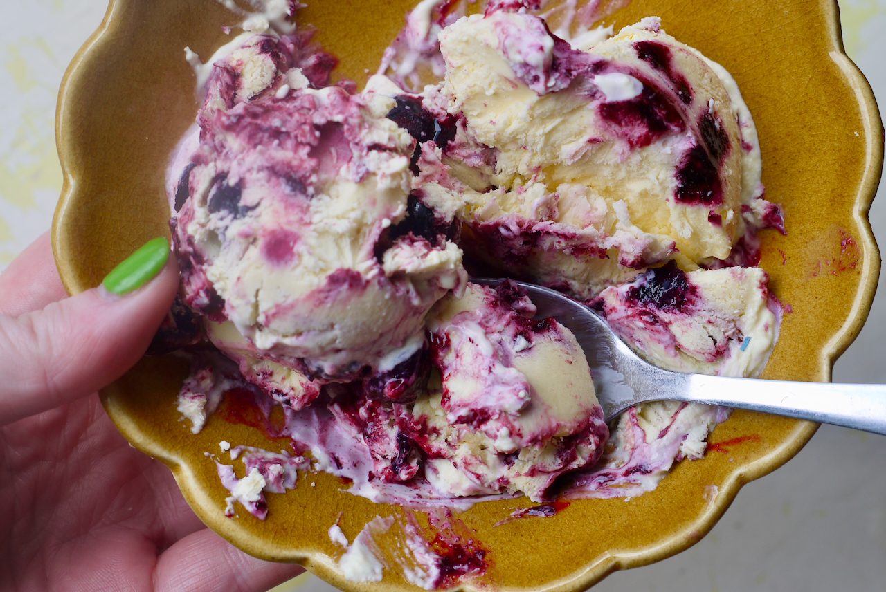 I had rather rudely relegated blueberries to a lower echelon of the berry heirarchy and in fact had intended for this recipe to be made with blackberries, which I hold in significantly higher regard. But in my local supermarket, the ill-stockedness of which should be studied because it’s so baffling for a shop of that size and centrality; there was not a blackberry to be found, only shelf after shelf of blueberries. The supermarket’s woeful ineptitude was my gain, in the end — the blueberries, trailing purply through the ice cream, leave a floral, grape-ish bloom of flavour that is nudged further into the light by the pinprick of almond essence and a dash of lemon juice. By the way, the almond essence will taste alarmingly like it’s taking over everything after you initially add it to the blueberries, it will, I assure you, diffuse once stirred through everything and frozen.