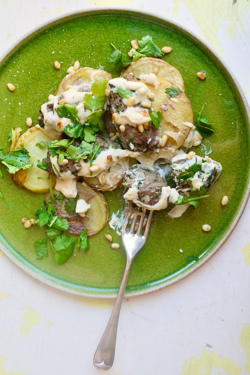 A simple yet luscious pairing — spiced meat, softly roasted potatoes — with cool and dense tahini sauce and buttery pine nuts. I’ve lightly adapted this recipe from the beautiful cookbook Zaitoun: Recipes from the Palestinian Kitchen by Yasmin Khan.