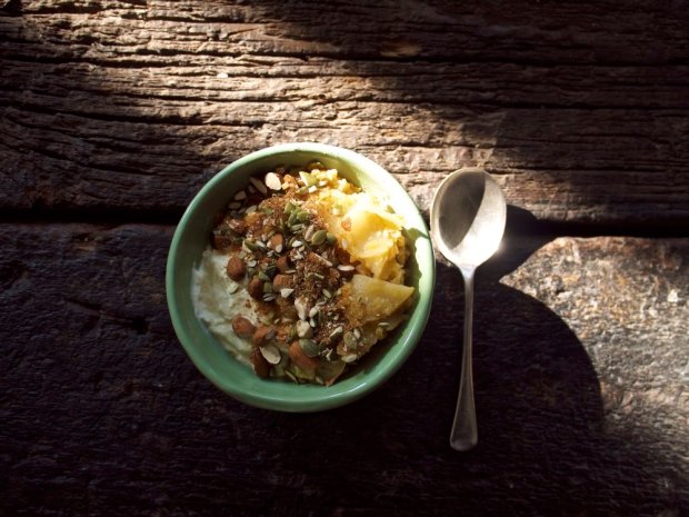 I often say (and prove) that it takes a village to raise me, as is the case with today’s recipe. I was gently prompted by my wise friend Charlotte to get snacks (that was actually essentially the entire advice but I was like my god, a fresh and bold perspective from a true maverick, which tells you what kind of baby the village is dealing with here. But also: having snacks on hand is useful! I mean, did you know that, without someone telling you?) And then, acting upon this advice and making myself a large batch of granola — cheap, filling, nutritious, snacky – I was suddenly panicking that I wasn’t going to get it photographed before darkness fell and my wise friend Kate was simply like “why don’t you take a little out of the oven and put it in a bowl and photograph that while you carry on cooking the rest” and I was like my stars, a genius walks amongst us, lo and behold her shrewdness meant I was able to take the photos you see here in the last fifteen minutes of workable light that the day held, and in doing so I realised I’d actually forgotten when I’d even put the granola in the oven in the first place, and it was in fact extremely ready to come out anyway. This all might sound really stupid but I’ve been experiencing higher than usual anxiety (I’m fine and my higher-than-usual anxiety is way lower than the everyday-anxiety of a few short years ago but it still comes around, you know?) and when it’s there it means my brain is less able to put one foot in front of the other than usual and my usual is honestly not that impressive anyway, and having things slowly spelled out to me still feels like I’m trying to sit an exam that I haven’t studied for, and what looks like a simple conclusion seems like the most staggering realisation.