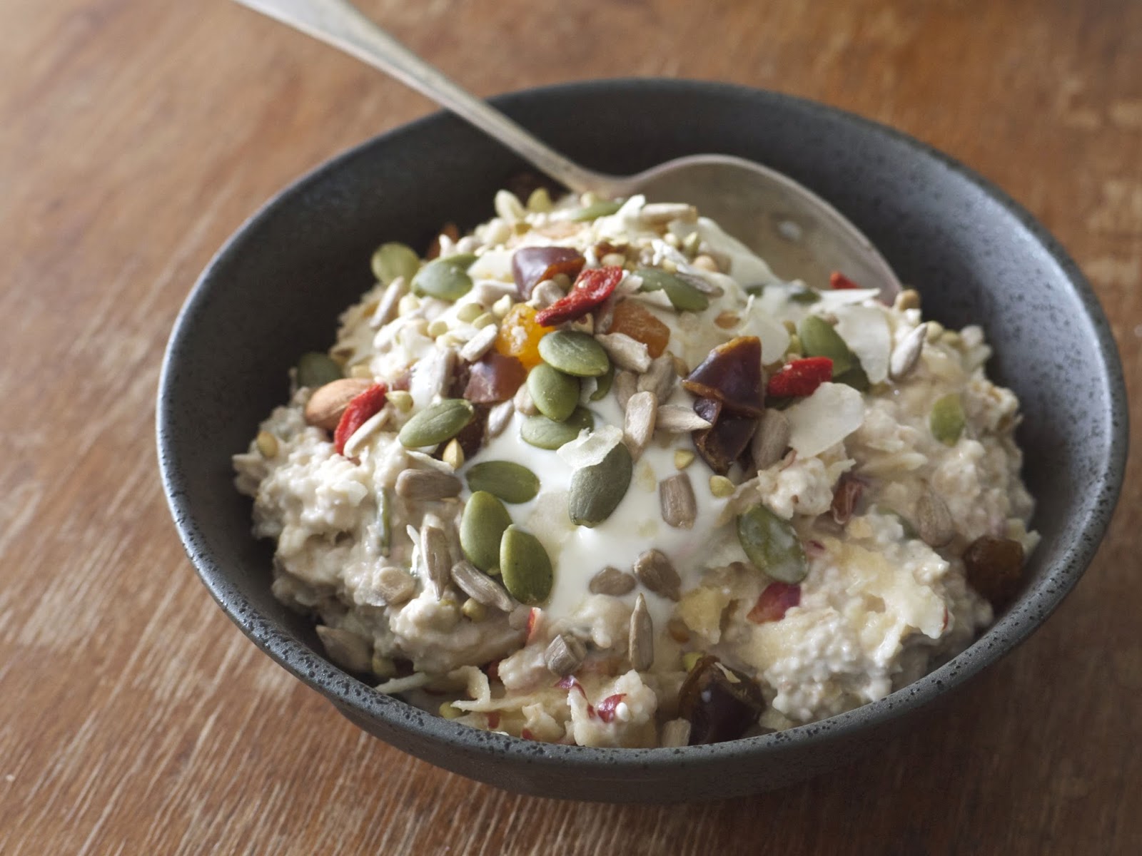 In wonderful news I am now thoroughly improved, mostly due to ibuprofen, rest, and gargling so much salt water and apple cider vinegar that I’m surprised I haven’t turned into a pickle. However, I choose to attribute my entire recovery to the incredible bowl of porridge that I fixed for myself yesterday. I’d taken enough painkillers that my throat was tentatively amenable to food, and I wanted to have something aggressively nutritious and filling, but also soft and warm as the underbelly of a rabbit. Oatmeal covers all these bases, as well as allowing me to be irritatingly cute by using the portmanteau of Sore Throatmeal, and I do love to be irritatingly cute.