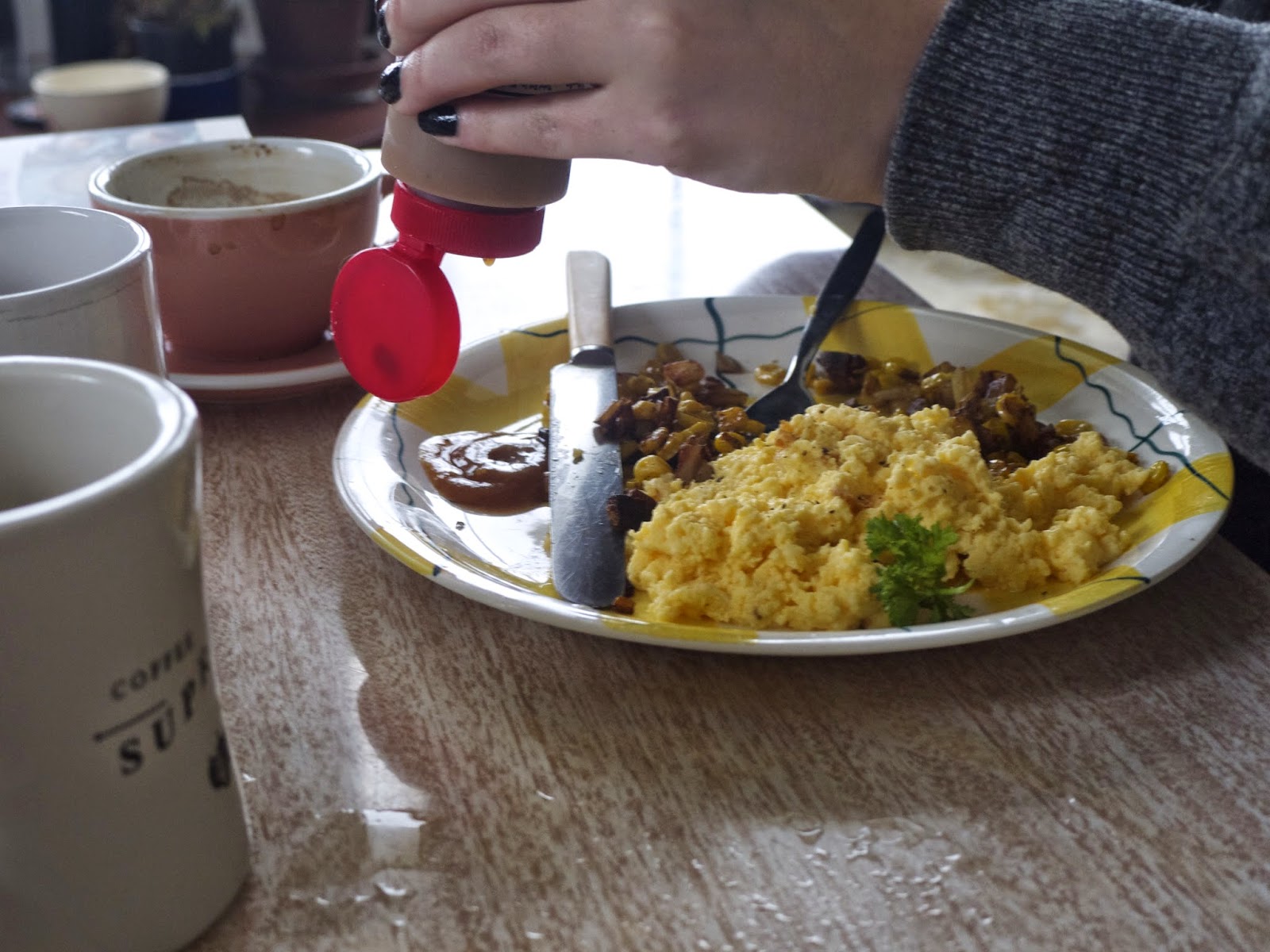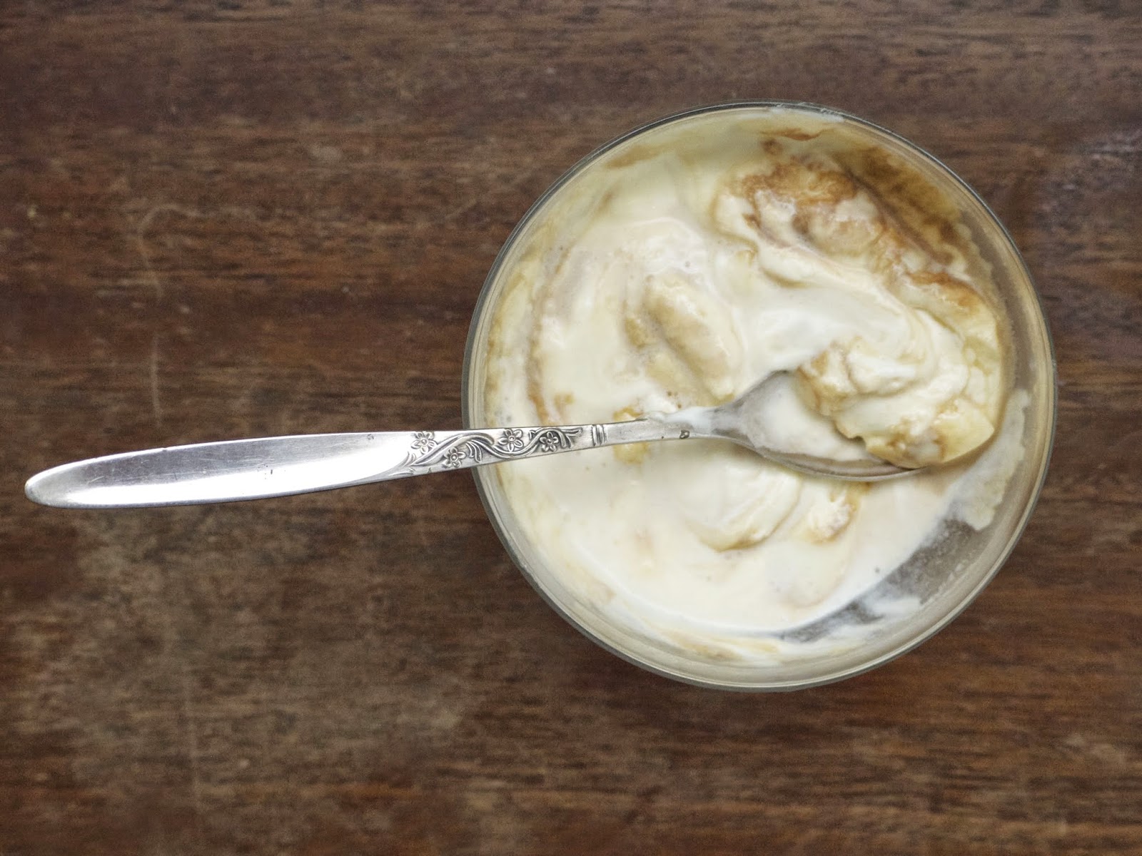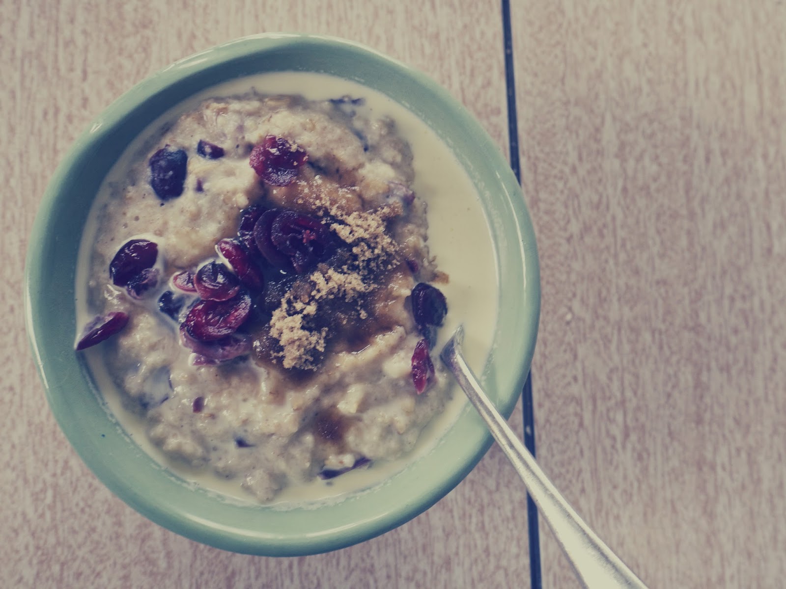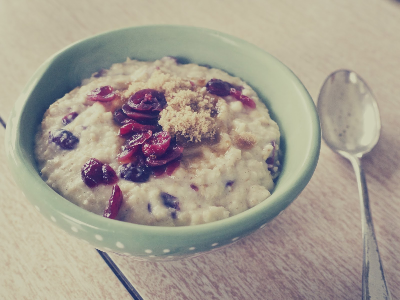 Once you’re done, remove it from the heat, drain the cranberries (I just used a spoon to hold them back while tipping the water into the sink) and stir them in along with a hearty pinch of cinnamon. Spatula all this into a deep bowl (a deep bowl helps it stay warm for longer!) and spoon over as much brown sugar and cream as your mouth desires.