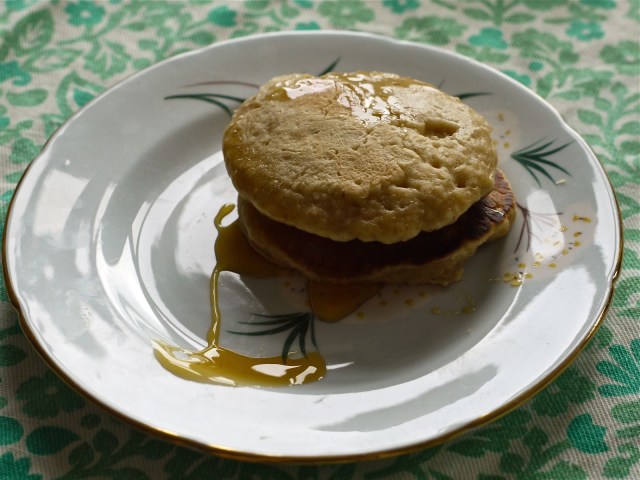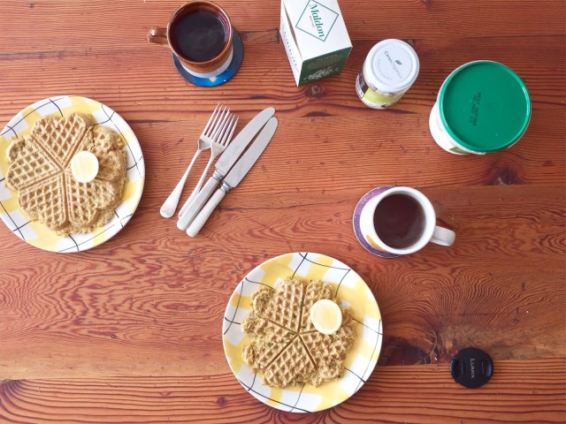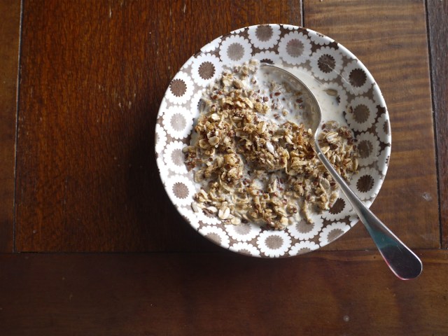Our table, which Tim spent a goodly segment of easter weekend sanding and repeatedly basting in polish, is back. Which means now if I make us breakfast on it, everything suddenly looks 97% more idyllic in photographs. As Prop Joe from much-clasped-to-modern-hearts TV show The Wire said, look the part, be the part, huh? (…he ended the sentence with something a little saltier than “huh”.)