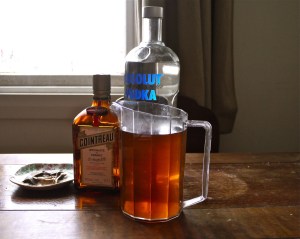 Like Marteani. Which uses lots of Cointreau – quelle expensive – vodka, and Earl Gray Tea (hence its name) to make a cocktail of orange-scented sumptuousness. Cointreau is not the kind of thing I would normally have just knocking around. However. I had about an inch in a 750ml bottle that my step-grandmother had given me, and then I had a further litre bottle that I bought in duty-free on the way back from Tim’s and my trip overseas in March. Both had sat untouched ever since they’d arrived (I think I got that partly-empty bottle in 2009?) and while it’s good not to use up all your expensive things at once, whatever they may be, there’s also a case to be made for actually enjoying what you’ve worked for before you drop it on the floor or something.