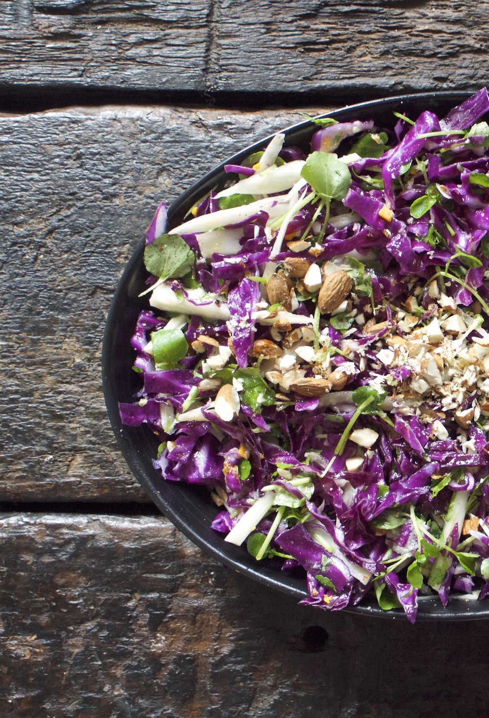And yet, here I am, and this head-cold/flu-adjacent thing that is occupying my bod is refusing to acknowledge my refusal to acknowledge it, and as such, I’ve done the only thing anyone can do – google which foods are the most aggressively able to fight germs and then make a recipe out of as many of them as I can get hold of. Since cabbage came up extremely high on the list of “will make your nose bleed from vitamin overload” I decided to use it as the base of a slaw, adding watercress and fennel, a dressing made from ten cloves of garlic, and a scattering of raw turmeric and almonds.
