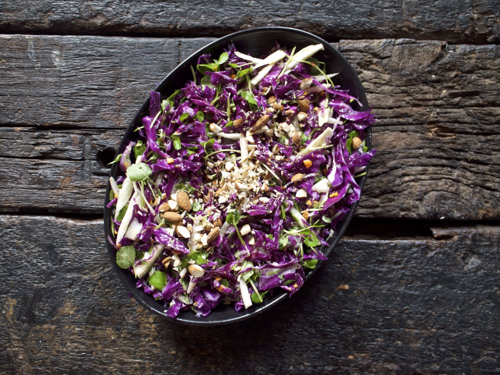 Get an enormous serving bowl ready. Peel the thick outer leaves from the cabbage and slice the rest as finely as you can manage, transferring it all into the serving bowl once you’re done. Repeat with the fennel (slightly more difficult due to the unwieldy shape of the bulb.) Then, and this might sound stupid, but drizzle over some olive oil and scatter over some salt and use your hands to vigorously lift and scrunch the cabbage and fennel. This will mix it together but also kind of soften and relax the aggressively stiff purple and white shreds a little. Just do it.
