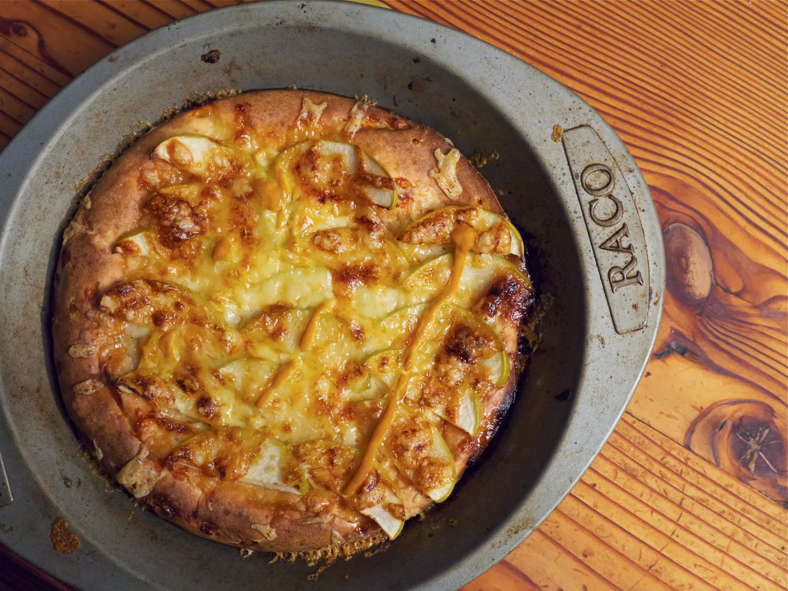 Arrange the slices of apple in overlapping layers in the centre square of the pastry, avoiding crossing the border that you’ve cut in. Mix the golden syrup, cornflour, water and salt in a small bowl and drizzle it over the apple slices.