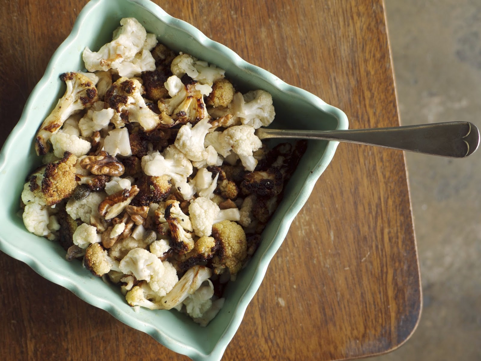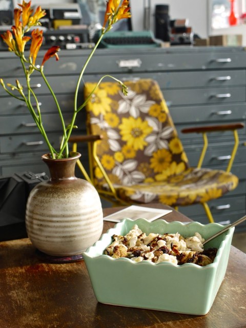 Set your oven to 220C/450F. Place the cauliflower pieces in a roasting dish and drizzle with the olive oil. Roast for about 20 minutes or until the cauliflower is very tender and becoming golden brown in places. Remove from the oven and allow it to cool a little.