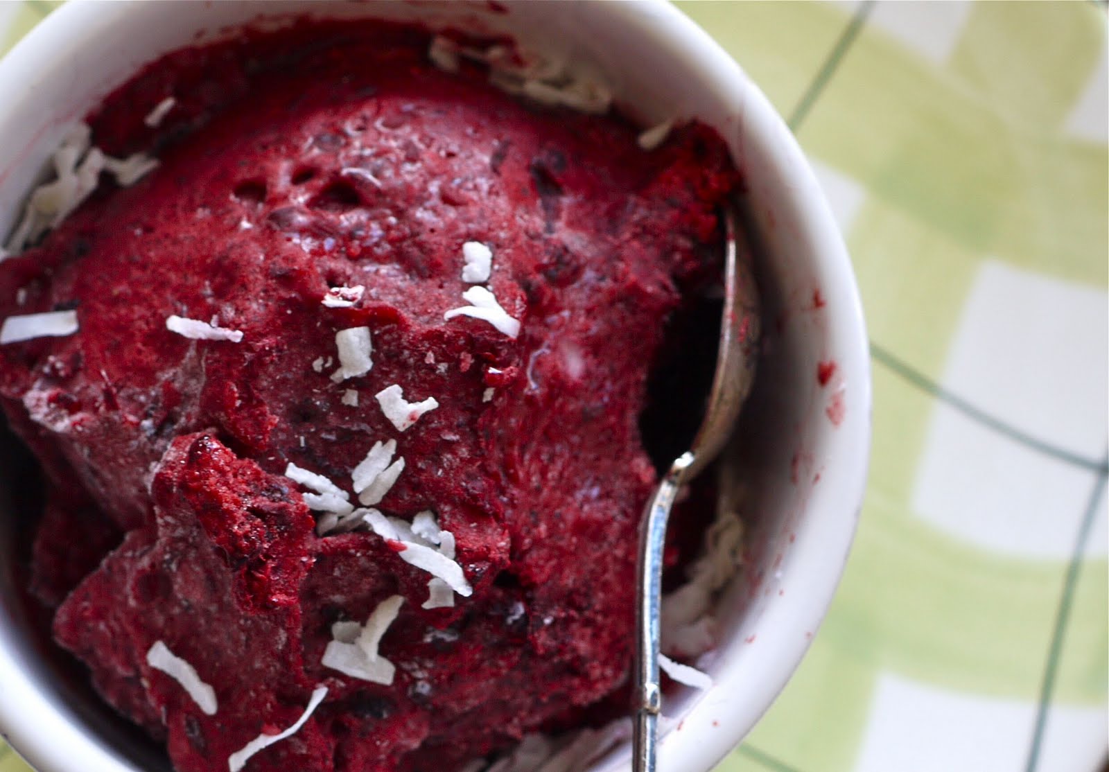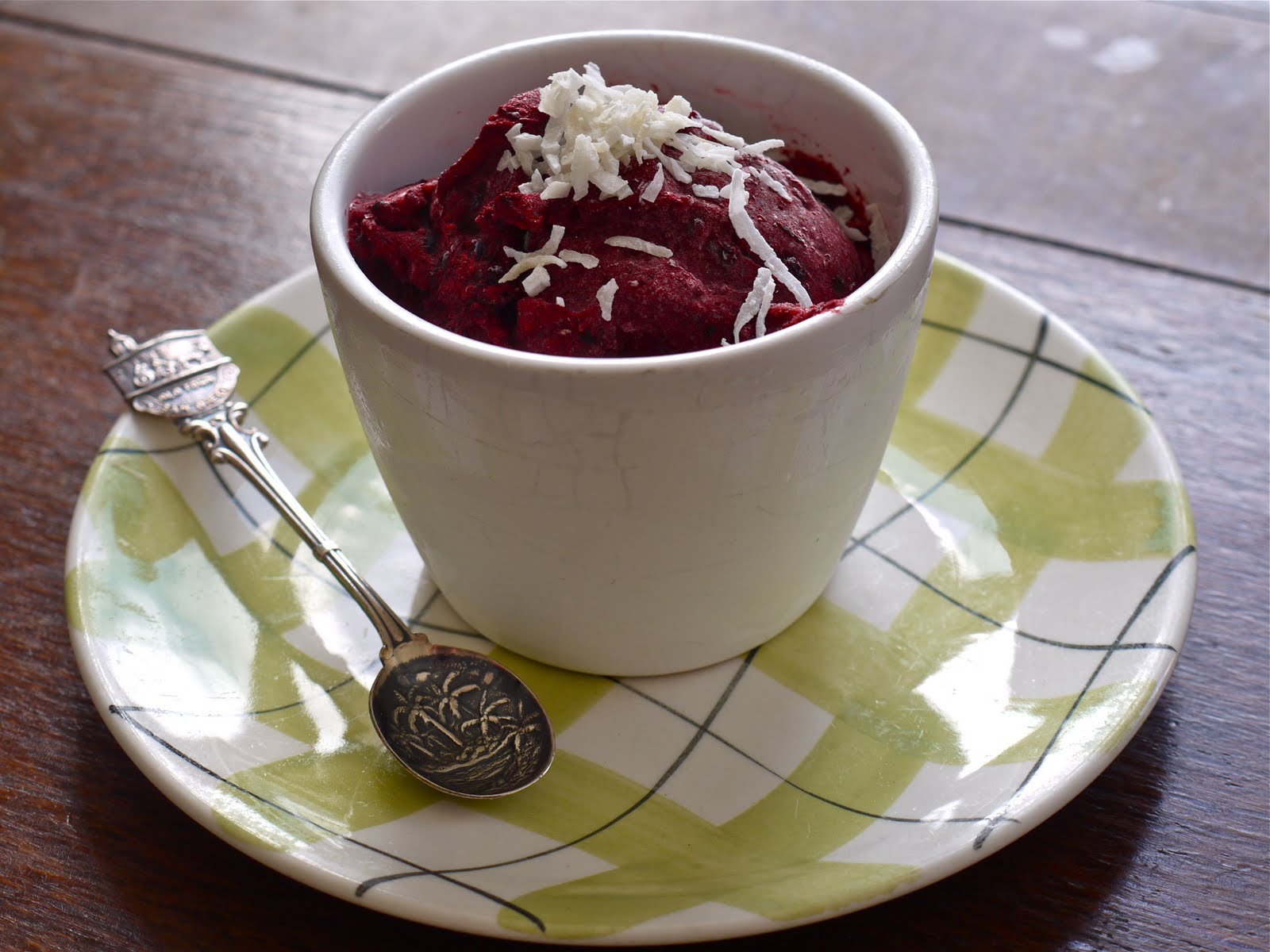 Put everything in a food processor. Add some sugar if you like. Blend. Be warned: it will make a racket. Use a spatula to scrape down the sides and process again till it looks like magical ice cream. Scoop into bowls and sprinkle with coconut if you like (or any kind of sprinkly thing, really).