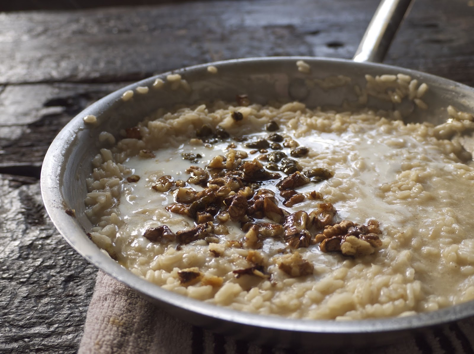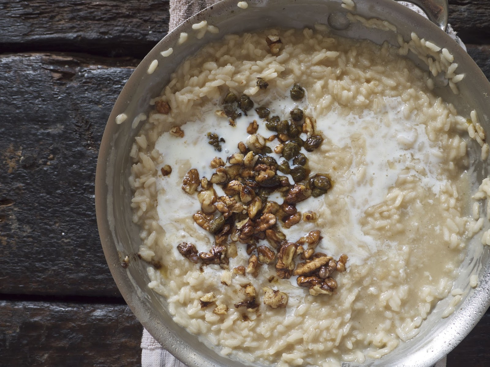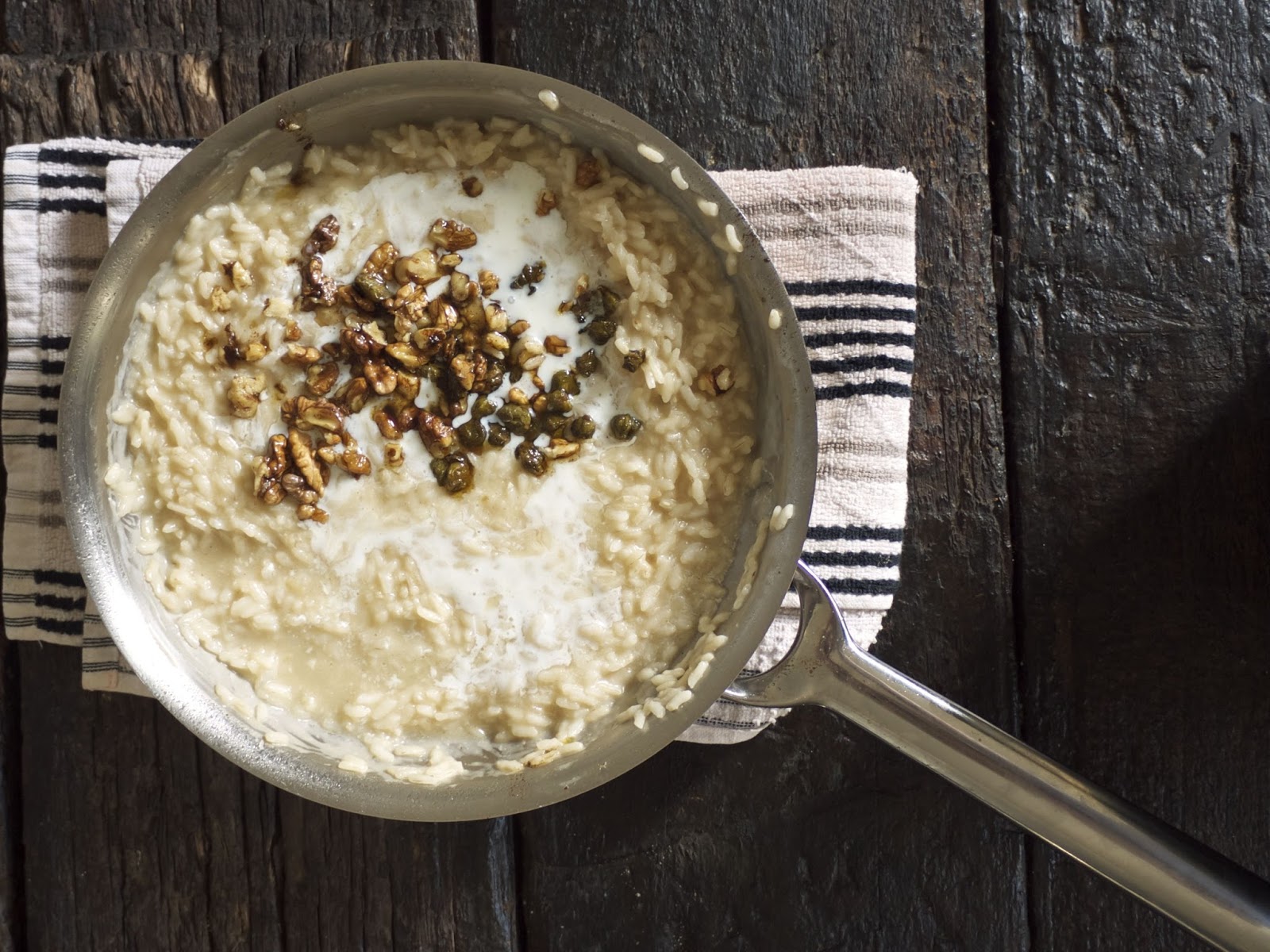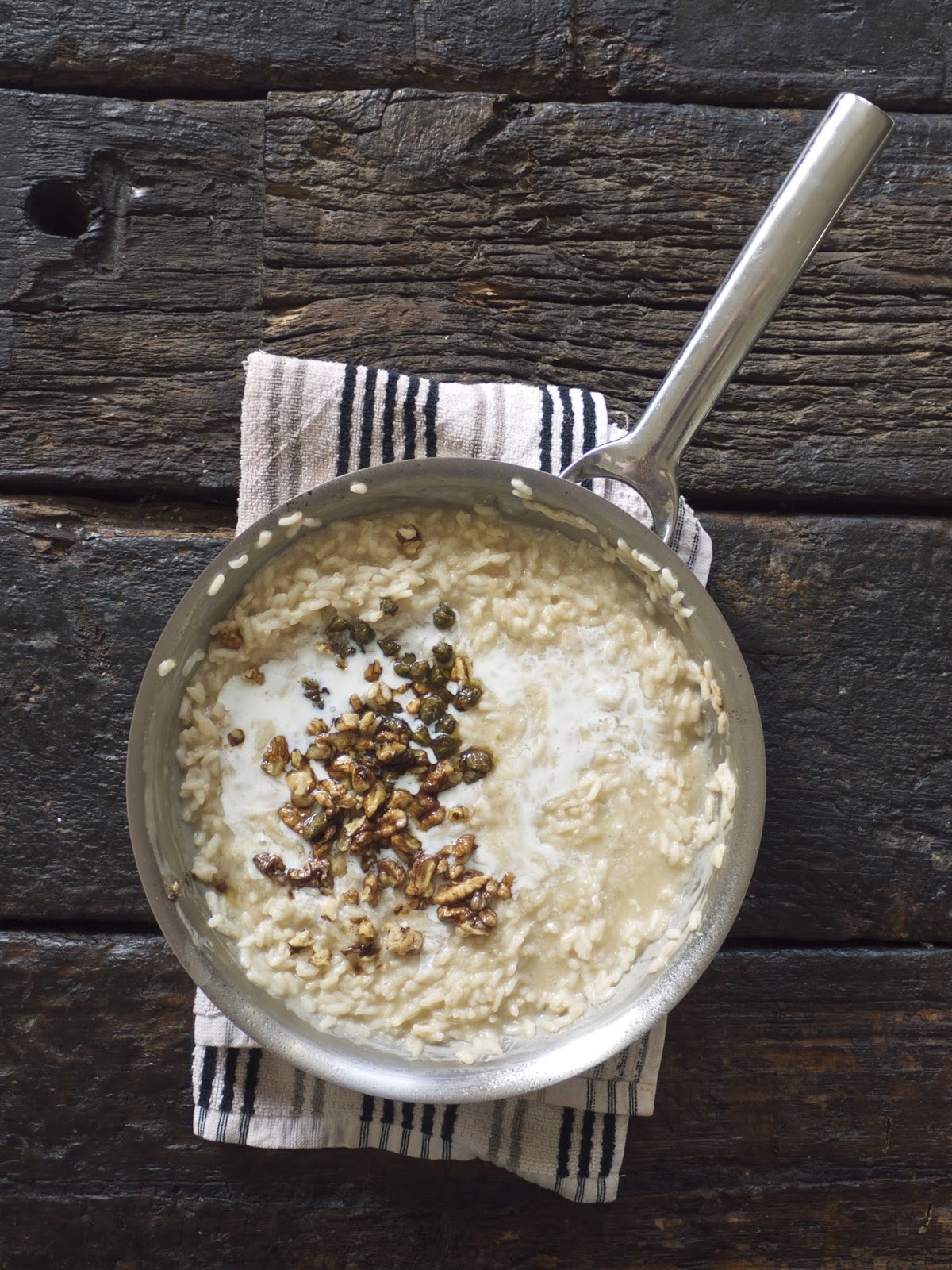 Transfer the cauliflower into the bowl of a food processor, and pour/spatula any remaining olive oil from the roasting dish in with it, along with the miso paste. Blitz thoroughly, stopping to spatula down the sides as needed, until it has formed a creamy puree with no solid pieces of cauliflower left in it. Taste to see if it needs any more miso, although I found this amount to be perfect. Transfer into a serving bowl. I sprinkled over some walnuts to make it look like more effort had been expended but this is entirely optional. Walnuts are delicious though! If you have a high-speed blender this will be super velvety, but a regular food processor will still work just fine, it might just take a little longer.