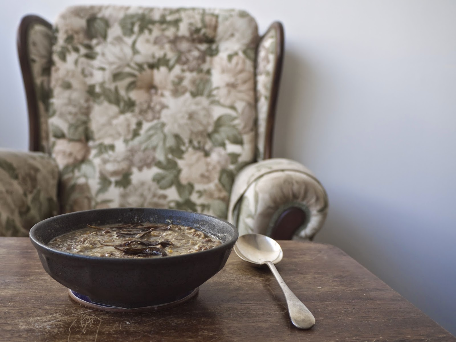 Roughly chop the onion and garlic. Make sure the mushrooms have any dirt brushed off and roughly chop them as well. Heat a tablespoon of olive oil in a large pan and fry all of this over a low heat until the onions and mushrooms are softened. Sprinkle over the flour and stir for a couple of minutes, before raising the heat and tipping in the red wine. Stir till the wine is absorbed into the floury oniony mushrooms, then tip in the walnuts, the nutritional yeast, and the cinnamon and nutmeg. Slowly add water – around 250ml/1 cup – and allow it to come to the boil, stirring continuously till it’s looking a little thick. You’re going to be blending this up so all the ingredients will naturally thicken it, so it doesn’t have to be too reduced down. Remove from the heat and allow to cool slightly before blitzing it carefully in a high speed blender. I tipped it straight back into the pan to reheat it, but by all means strain it if you want it to be super smooth. It may need more water added at this point if it’s too thick, but up to you. Finally add the soy sauce to taste, and serve hot over EVERYTHING.